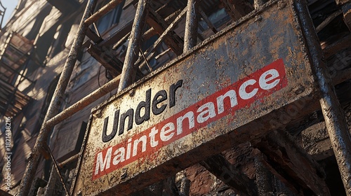 © Peerawat, Obraz premium Rusty Under Maintenance Sign on a Scaffolded Building Undergoing Restoration During Daylight