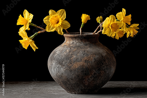 © Silent26, Obraz premium Rustykalny bukiet żółtych narcyzów w starej, glinianej wazie na ciemnym tle. Prosta kompozycja podkreśla naturalne piękno kwiatów i surowość naczynia.