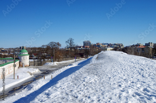 © Natalia Sidorova, Obraz premium Ryazan, Russia - March, 2021: Spaso-Preobrazhensky Monastery in winter day
