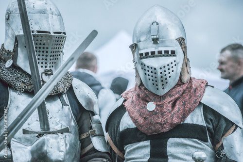 Obraz premium Rycerz. Bitwa pod Grunwaldem, średniowieczna bitwa z Krzyżakami, rekonstrukcja. Średniowieczne rycerstwo.