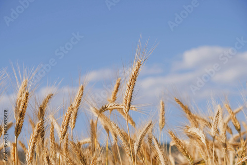 © Iryna, Fototapeta premium Rye field in a hot summer day, close up. Space for text. Natural summery background.