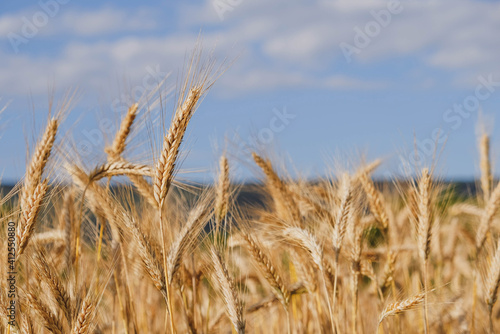© Iryna, Fototapeta premium Rye field in a hot summer day, close up. Space for text. Natural summery background.