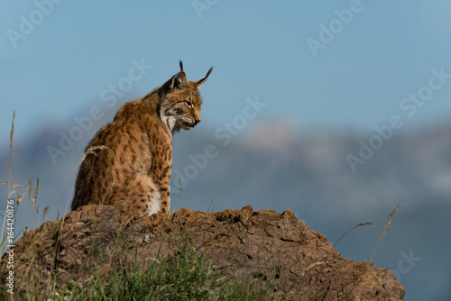 Fototapeta premium Ryś w profilu na skale patrząc w dół