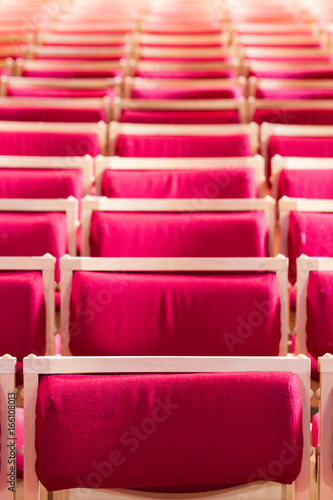 Fototapeta premium Rzędy pustych, czerwonych, aksamitnych siedzeń wewnątrz kościoła, stadionu,...