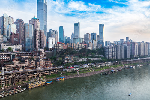 © fanjianhua, Obraz premium Rzeka i nowoczesne budynki na tle nieba w mieście w Chinach.