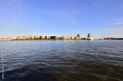 © W Korczewski, Naklejka premium Rzeka Ij i budynki na brzegu w pogodny dzień.