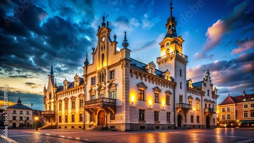 © renuga sachan, Fototapeta premium Rzeszow City Hall, Poland: Majestic Architecture at Sunset - Stock Photo