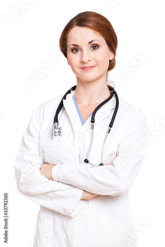 © fotogestoeber, Fototapeta premium Ärztin, die in die Kamera blickt