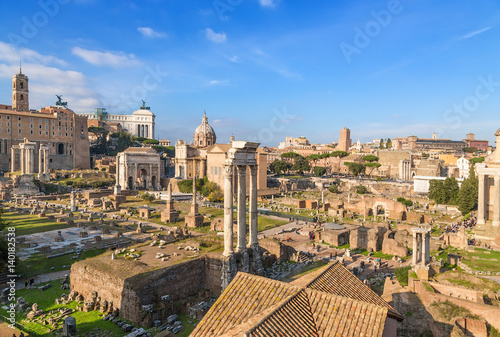 Obraz premium Rzym, Włochy. Starożytne ruiny Forum Romanum: Świątynia Saturna, Tabularia, Łuk Septymiusza Sewera, Kolumny Honoru, Świątynia Dioscurusa, Świątynia Boskiego Juliusza, Świątynia Westy