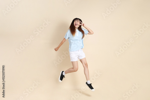 Fototapeta premium 20s Asian Woman in Light Blue Shirt and White Shorts