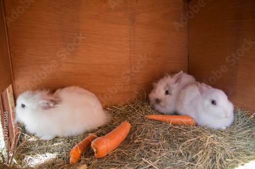 © Arkadi, Naklejka premium süße kuschlige Babykaninchen im Stall