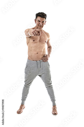 © Wordley Calvo Stock, Fototapeta premium 40s hispanic sport man and bodybuilder posing happy with strong naked torso showing fit muscular body