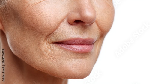 © Johannes, Obraz premium 50s middle aged old woman looking at camera isolated on white background advertising dry skin care treatment anti age skincare beauty plastic surgery cosmetology procedures close up half face view no