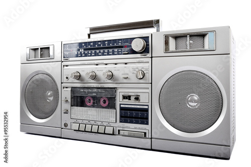 © Gerisima, Fototapeta premium 1980s Silver retro, boom box and headphone isolated on white. right side