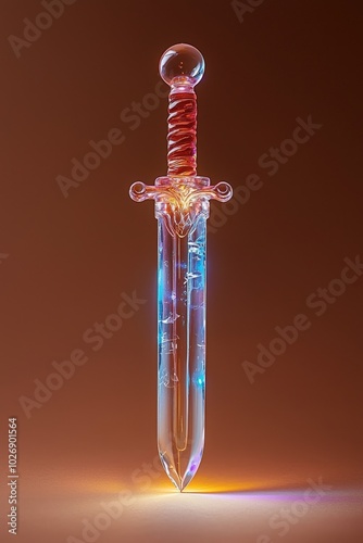 © CHA, Obraz premium 90s toy sword with light-up features isolated on a red background.