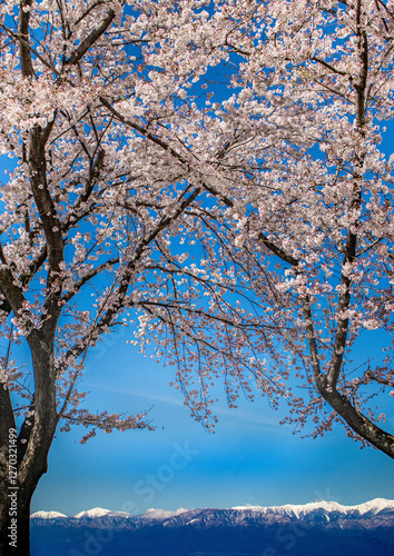 © Koji, Obraz premium 中央高速釈迦堂SAからの桜越しの冠雪の北アルプス