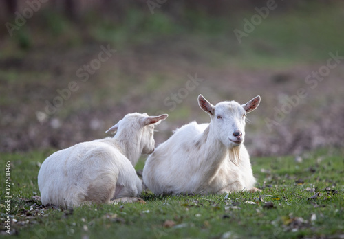 Fototapeta premium Saanen goats resting on meadow