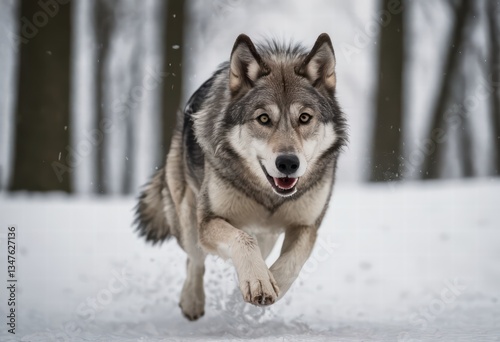 Naklejka premium Saarloos Wolfdog running in the frozen forest, dog in the nature, doggy...