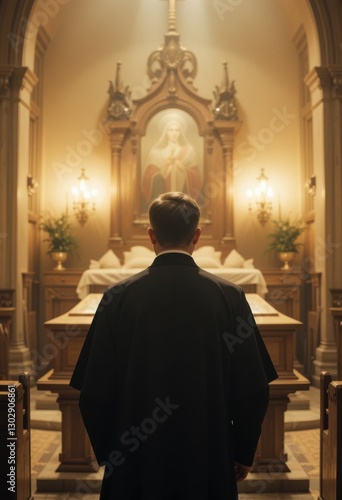 © Leonardo, Naklejka premium Sacerdote con vestimentas negras parado ante un ataúd de madera en una iglesia con poca luz, visto desde atrás