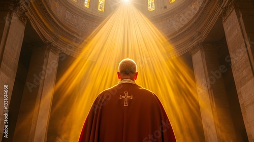 Fototapeta premium Sacred Sanctuary: A spiritual leader in ornate vestments stands within a magnificent cathedral, illuminated by heavenly beams of light, exuding serenity and reverence.