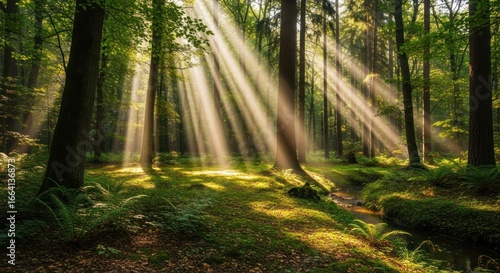 © Nelya, Fototapeta premium Sacred Sunbeams Illuminate a Lush Forest Glade and Gentle Creek