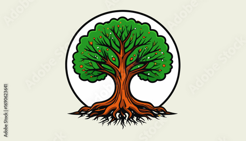 Naklejka premium Sacred tree with roots in circular emblem