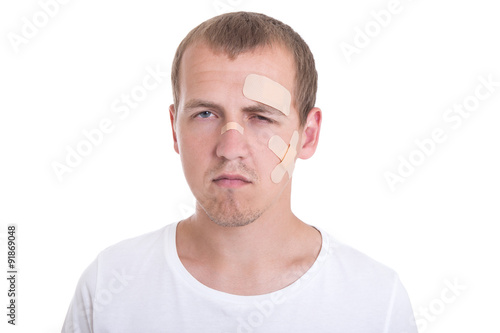 Fototapeta premium sad and injured man with adhesive plaster on his face