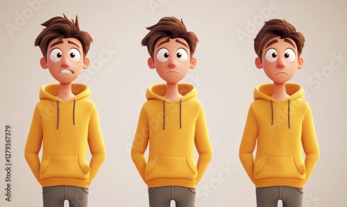 © Gupta, Naklejka premium Sad and Stressed Male Cartoon Character in Yellow Hoodie, 3D Style Design on Light Background, Depicting Human Emotions and Expressions