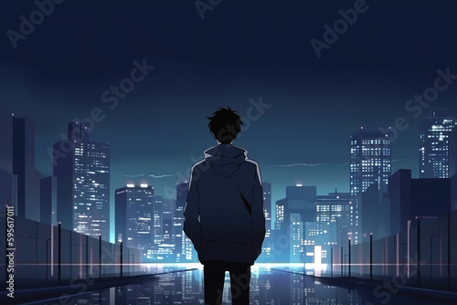 © Boadicea, Fototapeta premium Sad anime guy walking alone on city street.