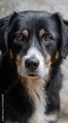 Fototapeta premium Sad dog portrait brown eyes mixed breed black fur white muzzle