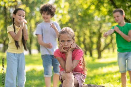 Fototapeta premium Sad girl and kids mocking behind outdoors