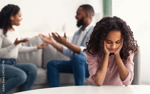© Prostock-studio, Obraz premium Sad girl with her fighting parents in the background