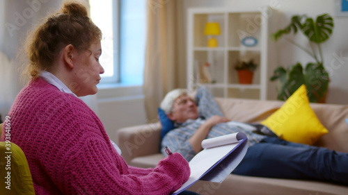 © nimito, Fototapeta premium Sad gray-haired older man talking about his problems during psychological consultation