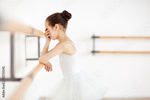 Naklejka premium Sad little girl in ballet dress crying by wooden bars during class