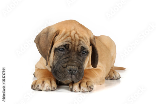 © eds30129, Obraz premium Sad-looking Bullmastiff puppy lying down on a white background