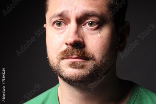 Obraz premium Sad man crying on black background, closeup