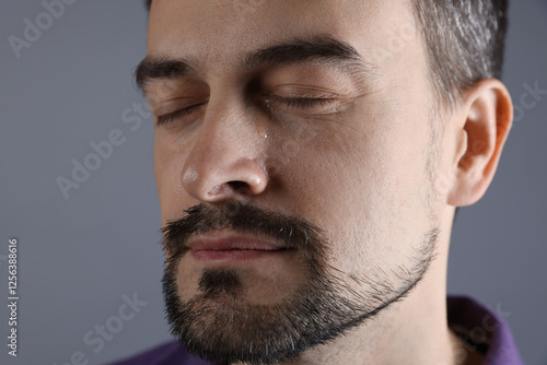 Obraz premium Sad man crying on grey background, closeup