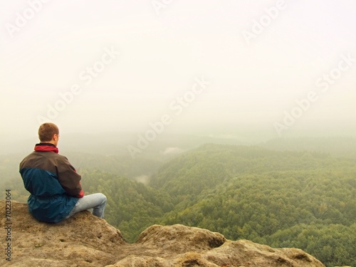 © rdonar, Naklejka premium Sad man sit on the peak of sandstone rock and watching down