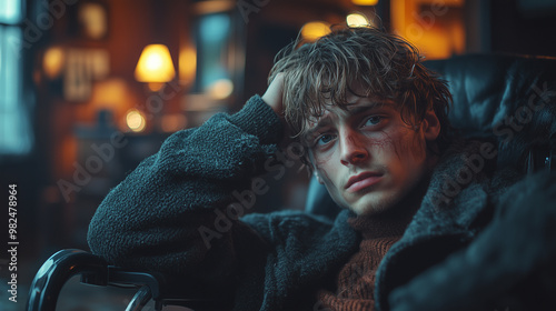 © Just1, Obraz premium Sad man sitting in a wheelchair and holding head. Emotional and depressed scene.