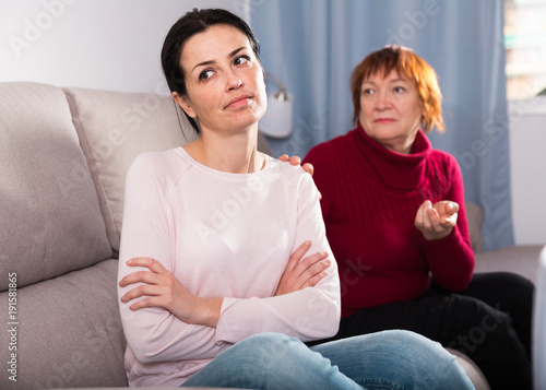 Obraz premium Sad mature female and daughter at sofa after quarrel