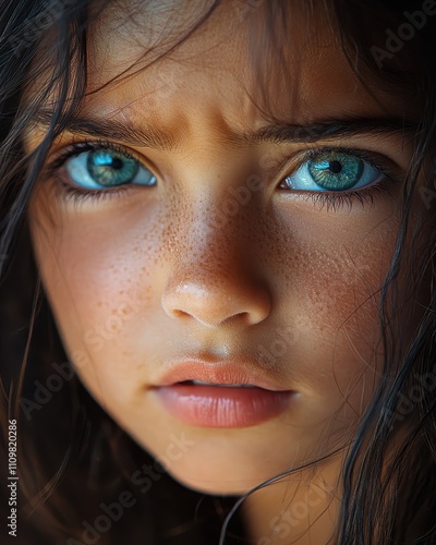 © Sergiy, Fototapeta premium Sad olive-skinned girl with blue eyes crying in extreme close-up portrait during sunset
