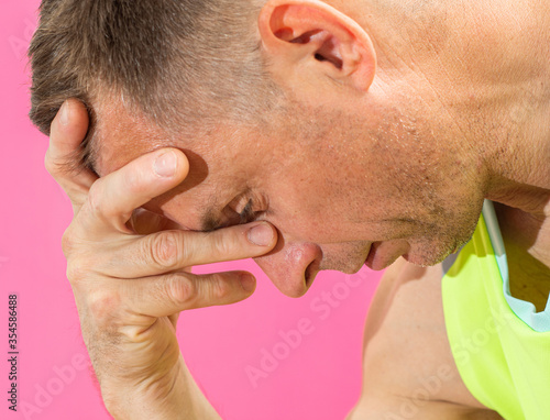 © vbaleha, Obraz premium Sad tired man suffering from headache