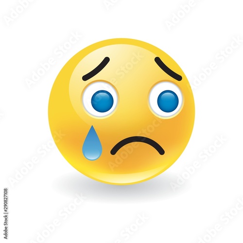 © Rudzhan, Fototapeta premium Sad upset little yellow round emoticon crying with a large blue teardrop and morose expression over white with drop shadow, vector illustration