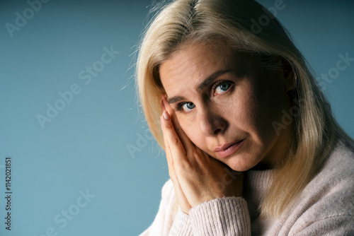 © Maria Vitkovska, Fototapeta premium Sad woman holding face in hands on blue background
