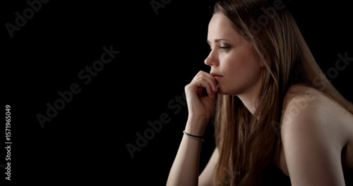 © 4kclips, Fototapeta premium Sad woman with hand on chin is looking down and thinking about something on black background