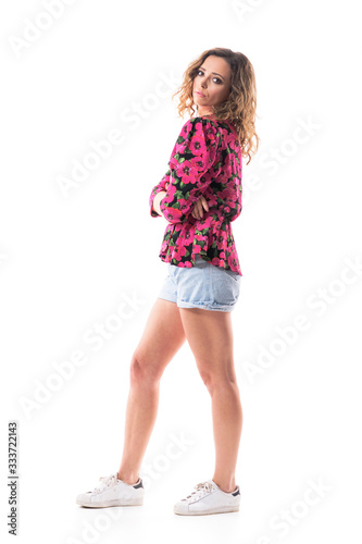 © sharplaninac, Fototapeta premium Sad worried beautiful young woman looking at camera in stylish summer clothes. Side view. Full body isolated on white background.