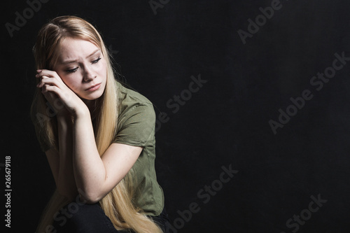 © xartproduction, Fototapeta premium Sad young woman going to cry in a black background