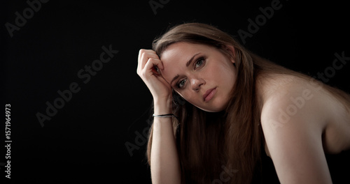 Obraz premium Sad young woman resting her head on her hand, showing loneliness and sadness