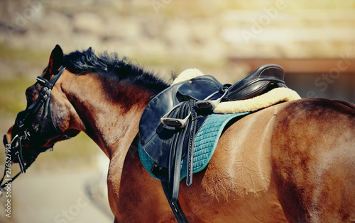 © Azaliya (Elya Vatel), Obraz premium Saddle with stirrups on a back of a horse