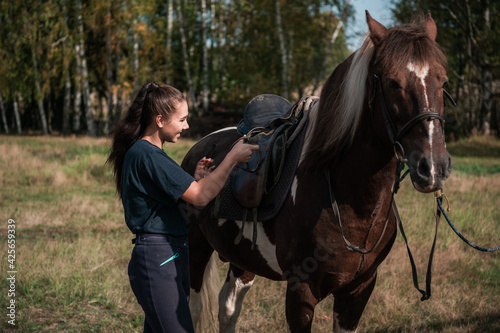 © Anna Kosolapova, Obraz premium Saddling a beautiful mare on a ranch shows a young horse owner
